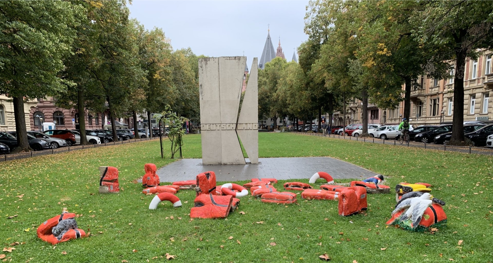 Die bunt bemalten Steine die wir hier sehen nehmen Bezug zu den orangefarbenen Rettungswesten an den Küsten des Mittelmeeres. Deren Träger hatten sich ihrer entledigt, sobald sie sicheren Boden unter den Füßen hatten. Die Aufnahmen die wir aus den Medien kennen sind mittlerweile Bild-Ikonen (genauso wie das Foto des ertrunkenen Kindes Alan Kurdi).